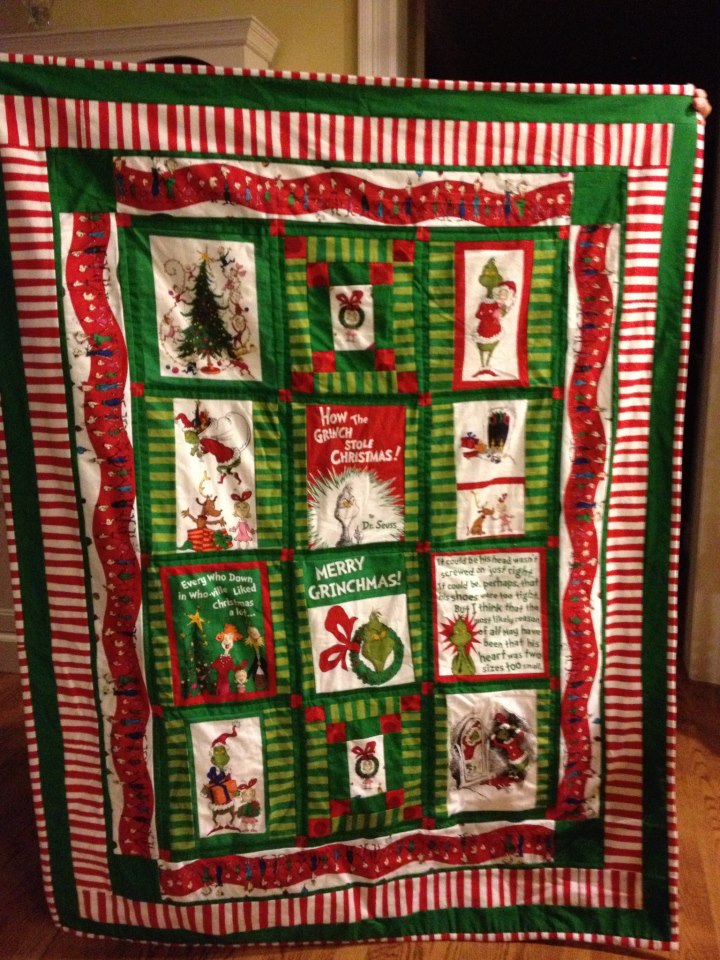 Being that we’re now into November, that means it’s the start of the Christmas season here at our place. And, according to tradition, the first wave of decorations went up this weekend. Added to my collection this year is this Grinch quilt, which I finished up last week. It’s so cozy and snuggly.