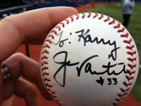 Last year in September a friend of mine flew out to Toronto to watch them play the Sox. Since he’s friends with a few of the Blue Jays, he and his son were welcomed onto the field. Who should they come across but the captain of the BoSox himself, Jason Varitek, just after batting practice. My friend knew what a rabid fan I am of Tek’s, so he went over and asked him to sign a baseball for me. Which he did. Okay, he totally spelled my name wrong, but I think it’s because my friend doesn’t know how to spell my name right. That ball is one of my most treasured possessions, and it marks one of the last games Tek had in the majors.