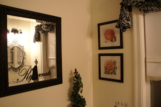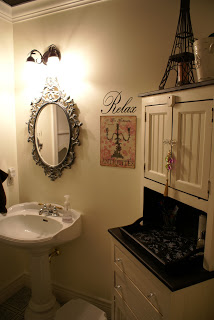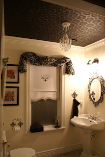 Next, I painted the curtain rod and brackets black, hung the curtain panel over the window and added the pretty crystal chandelier. I also found these really cool tin fleur-de-lis at a local French shabby-chic shop, and decided I could make them into a TP holder. I antiqued them and anchored them into the wall, then made a TP roll with a dowel and two crystal knobs on either end. (I was pretty pleased with myself, lol)