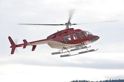 By Friday he was feeling better, so I reluctantly remade plans to go up to Vernon (in the Okanagan Valley) for my uncle’s surprise 50th birthday. Uncle Kev’s my favorite uncle, and he’s in the dedication for Cover of Darkness. He’s a battle Captain in the reserves, plays softball and loves history, on top of being a hell of a nice guy. Enough said. But as it turned out, since my hubby was staying home with Little Weasel, I had to take Big Weasel with me and thought I’d catch a ride up with my dad. Only he’d decided at the last minute they weren’t going to drive. They were flying up in his new Bell 407 helicopter instead.
